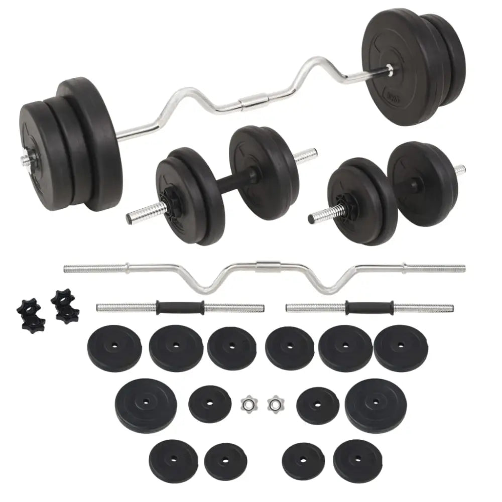 Deze veelzijdige halterset is perfect voor het trainen van de borstspieren, biceps, armen, triceps en rugspieren. Hij bevat twee schijven à 10 kg, vier schijven à 5 kg, vier schijven à 2 kg, vier schijven à 1,25 kg, een halterstang en twee dumbbell halters, en heeft een totaal gewicht van ca. 60 kg